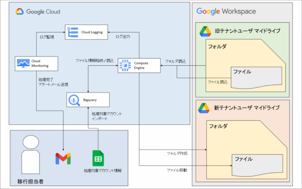 弊社にこのようなご相談があり、様々な移行手段を試しました。しかし、通常のデータ移行ツール(Google Workspace Migrate等)にて、ご要件に対応できる手段がなく、最終的に以下のようなアプリケーション開発を行い、移行作業を実施することになりました。