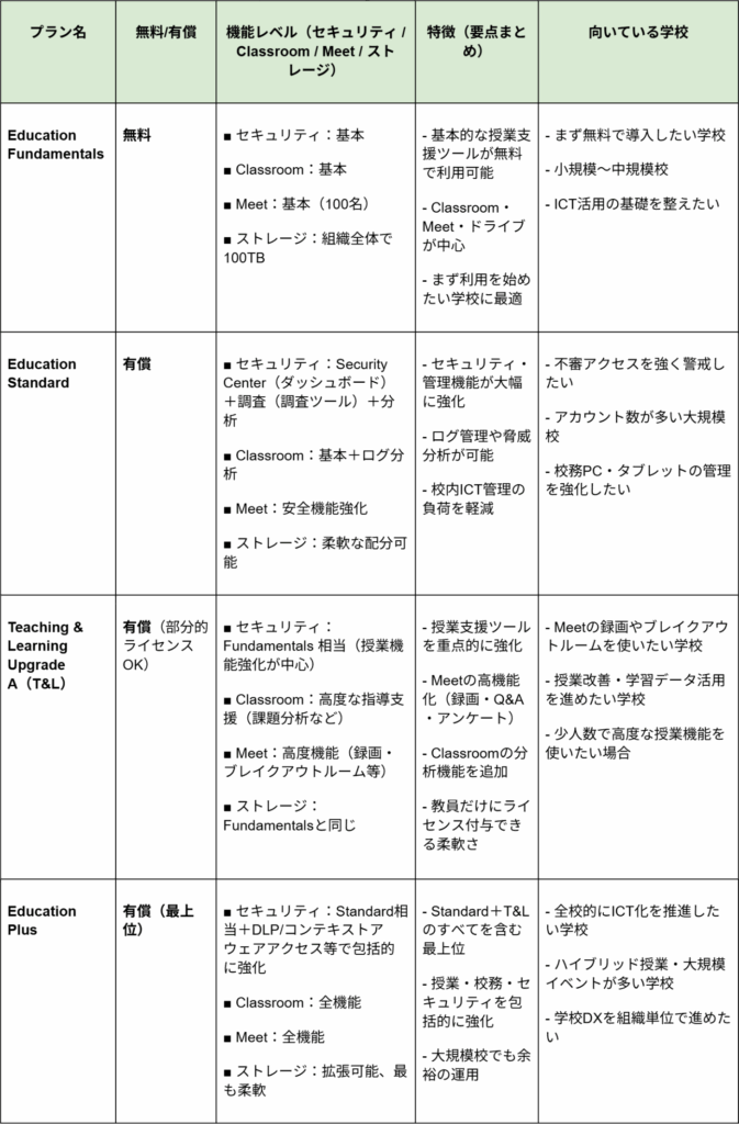 ■ Google Workspace の教育向けエディション4種の概要