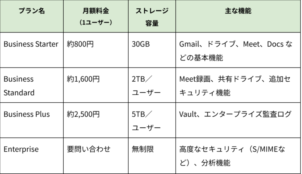 Google Workspace は、企業規模や用途に応じて複数のプランが用意されています。
